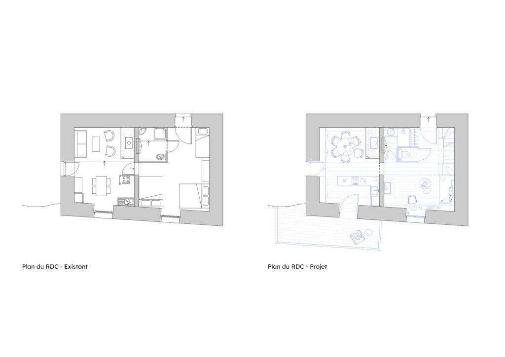 L’objectif a été ici de repenser l’intégralité du rez-de-chaussée pour créer de espaces de vie plus généreux et intégrer un escalier menant à l’étage. De plus, une grande terrasse a été imaginée dans le prolongement de la cuisine et qui offre une vue dégagée sur la vallée en face.