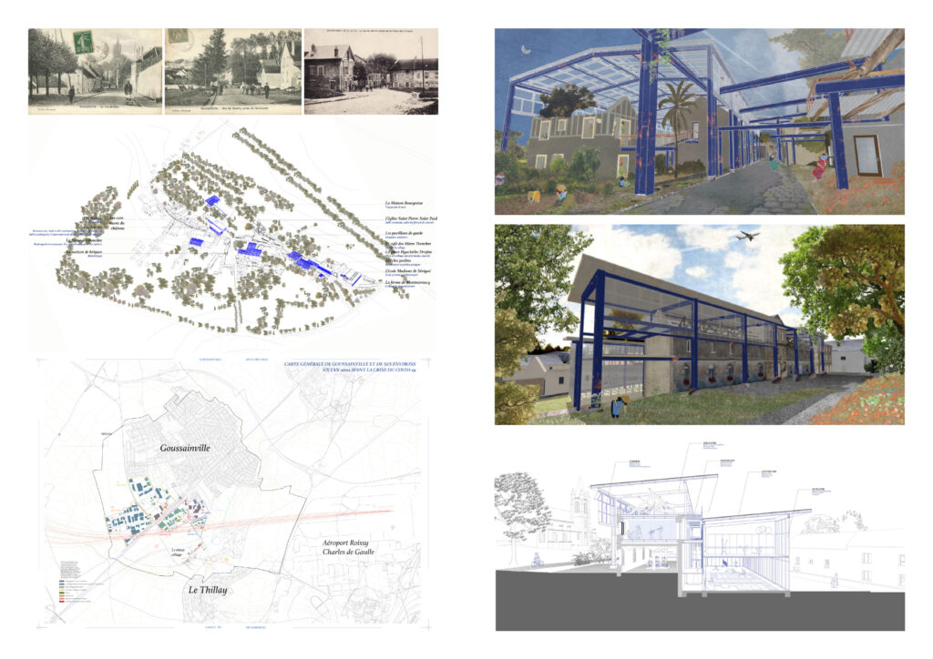 Ainsi, nous avons accepté les choses comme elles sont et nous faisons projet avec ce qui est déjà présent et disponible. Nous avons imaginé des interventions ponctuelles et précises dans le village, qui, si elles ne semblent pas avoir de connexion de prime abord, sont liées à la fois par leur langage architectural et par leur sens et leur impact, comme une maille venant réinsuffler la vie au cœur du village de Goussainville.